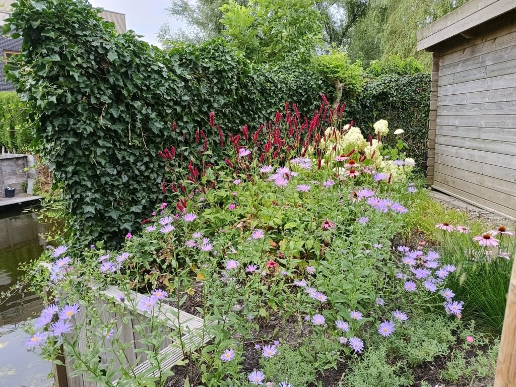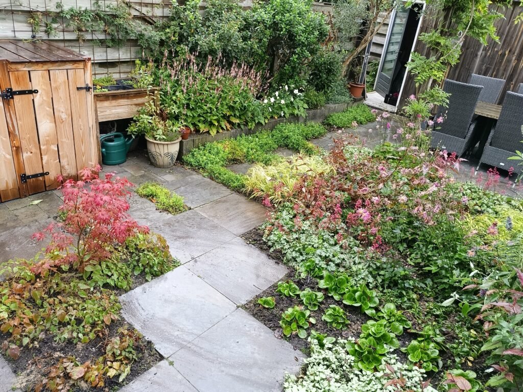2024 450 m² Ontwerpdoelen Heesters snoeien en gras vervangen voor vaste planten border Ontwerpdoelen Gras verwijderd door keren. Kleur en textuur in alle seizoenen Vijvertje gemaakt Grond verbeterd met biologische compost Bestaande Heesters gesnoeid en verplant Ombouw voor de containers