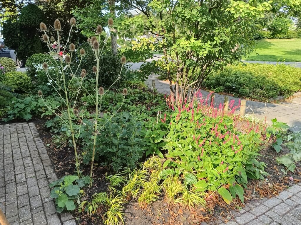2025 50 m² Ontwerpdoelen Voortuin reorganiseren Ontwerpdoelen 7- blad, worteldoek en boomschors verwijderen Grond verbeteren Kleur en textuur in alle seizoenen Stapstenen pad met bodembekkers Bestaande Planten Behouden Hibiscus, dierbare herinnering van het oude huis en hortensia’s behouden.